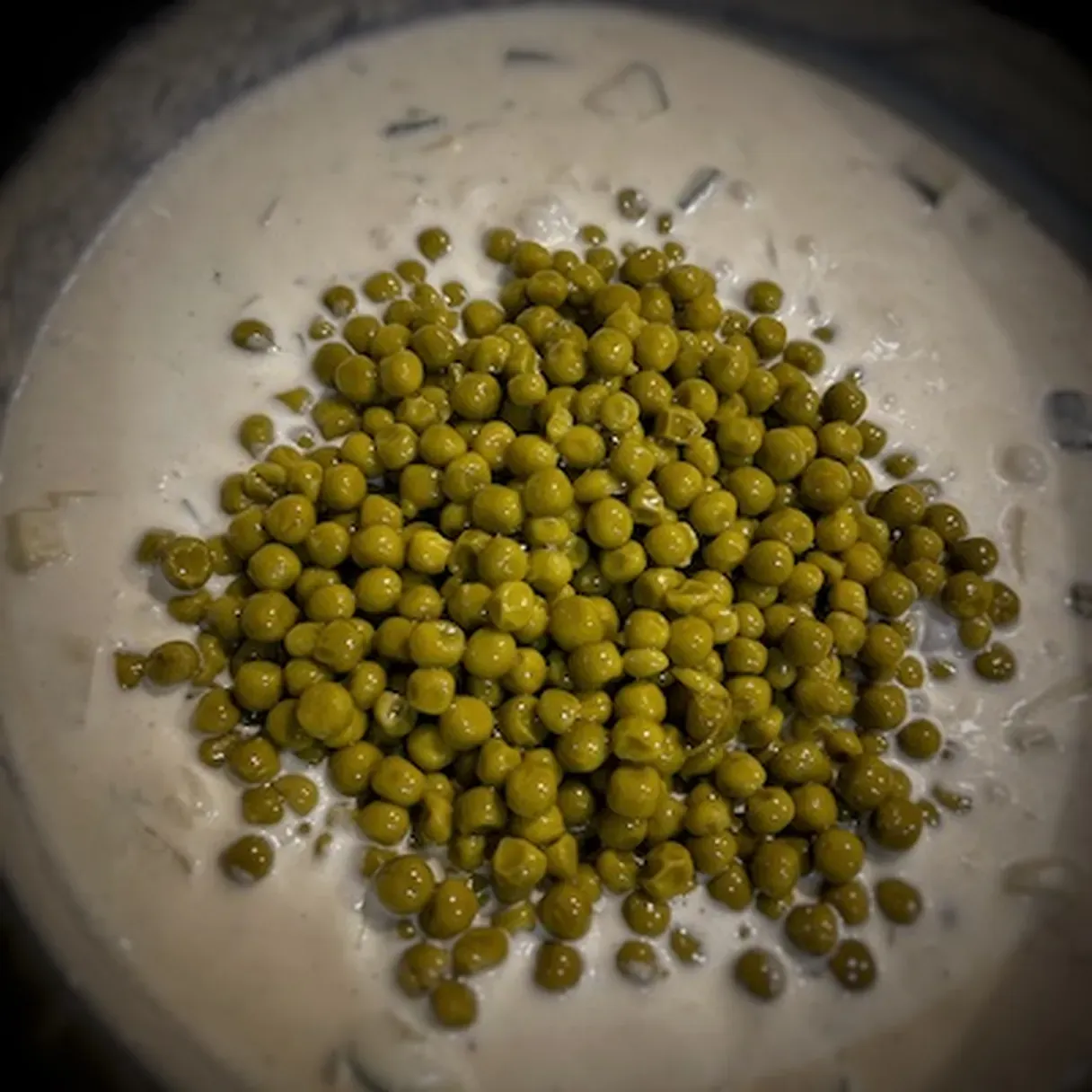- Add the canned peas, taste for salt and pepper, and remove the heat.