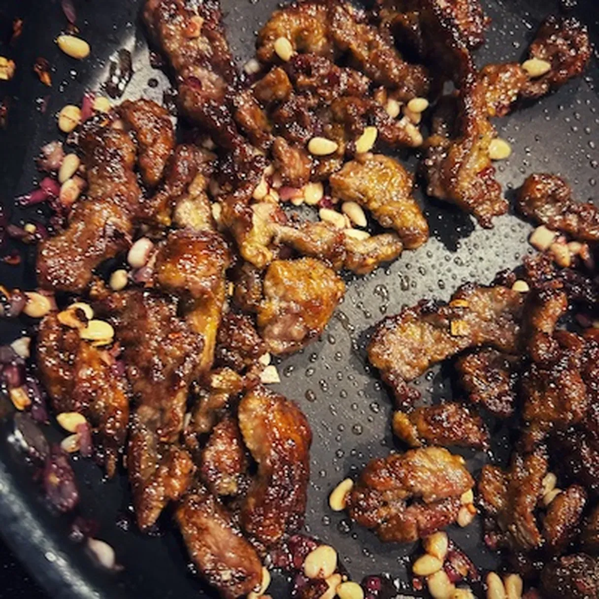 - Add pomegranate syrup, return the beef and pine nuts, and cook for 2-3 minutes until caramelized.