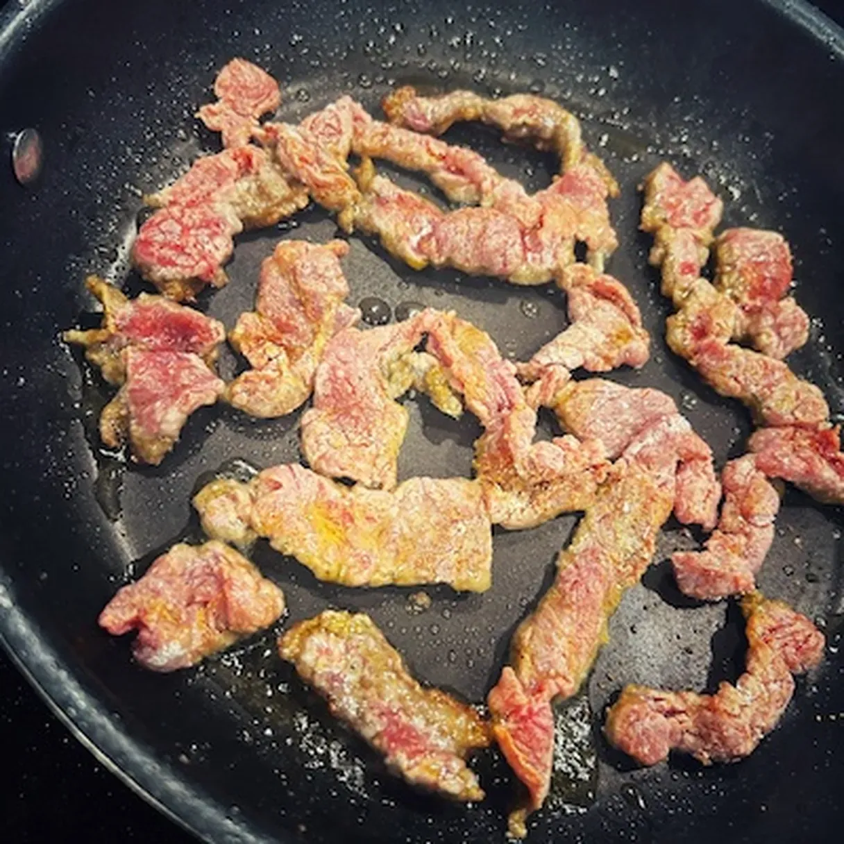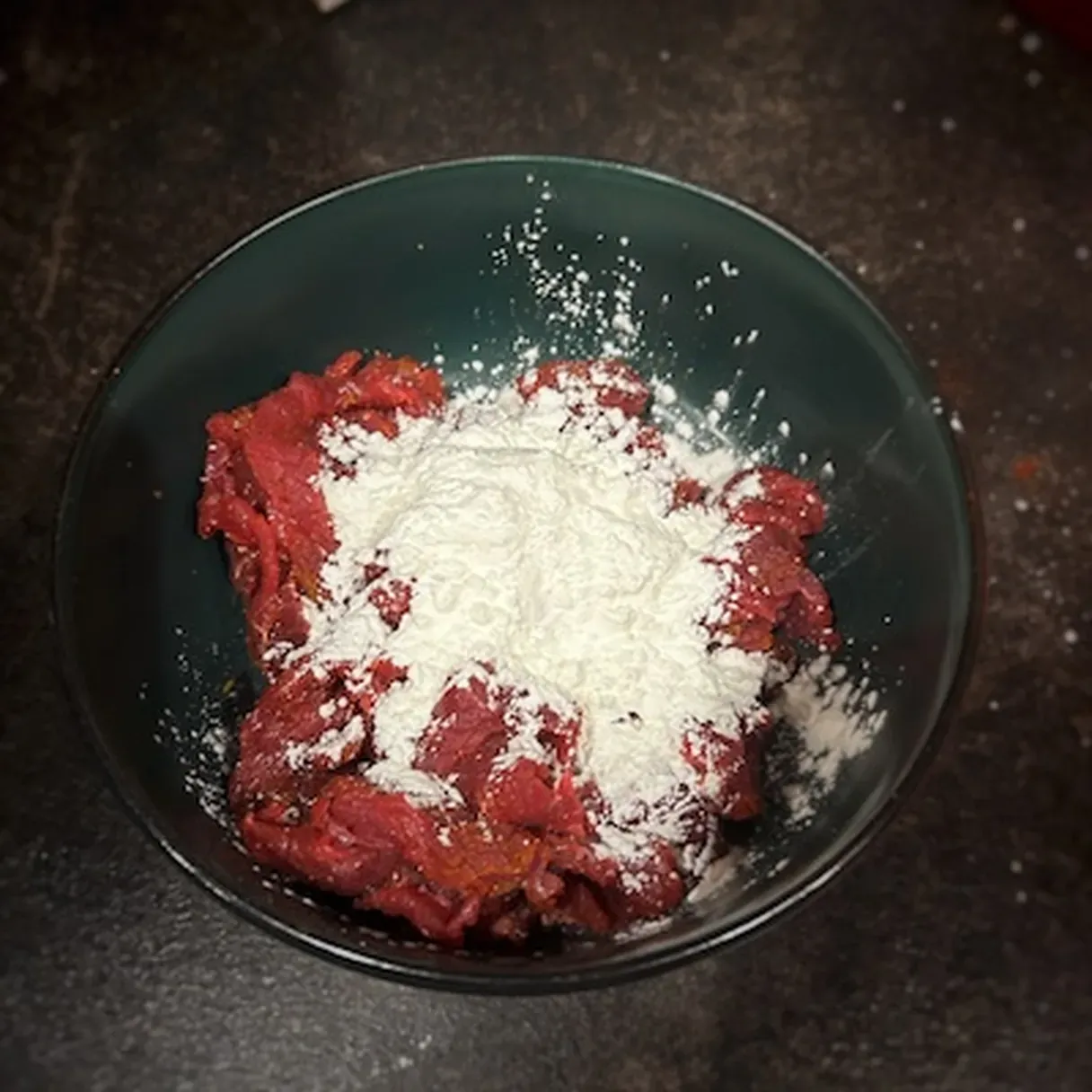 - Slice the beef into thin strips and mix with starch, salt, pepper, garlic, paprika, and turmeric.