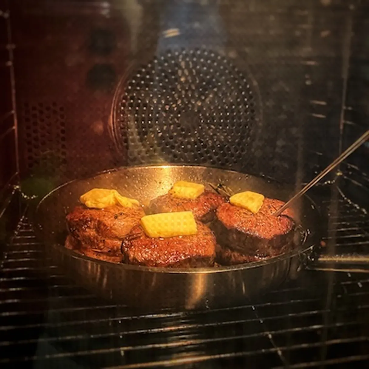 - Place 1 cube of butter on each meat medallion, then place the skillet in the preheated oven at 200 degrees Celsius (400 F) for 10-13 minutes or until the internal temperature reaches 50 degrees Celsius (125 F).