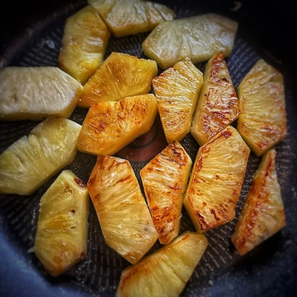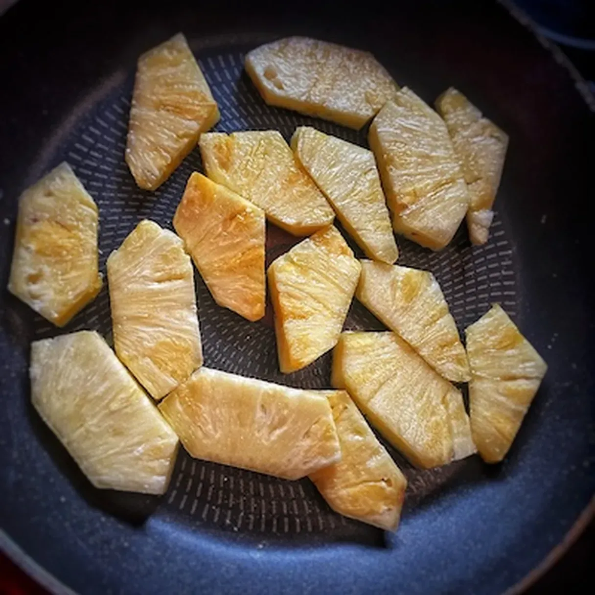 - Heat up a non-stick skillet and char the pineapple slices.