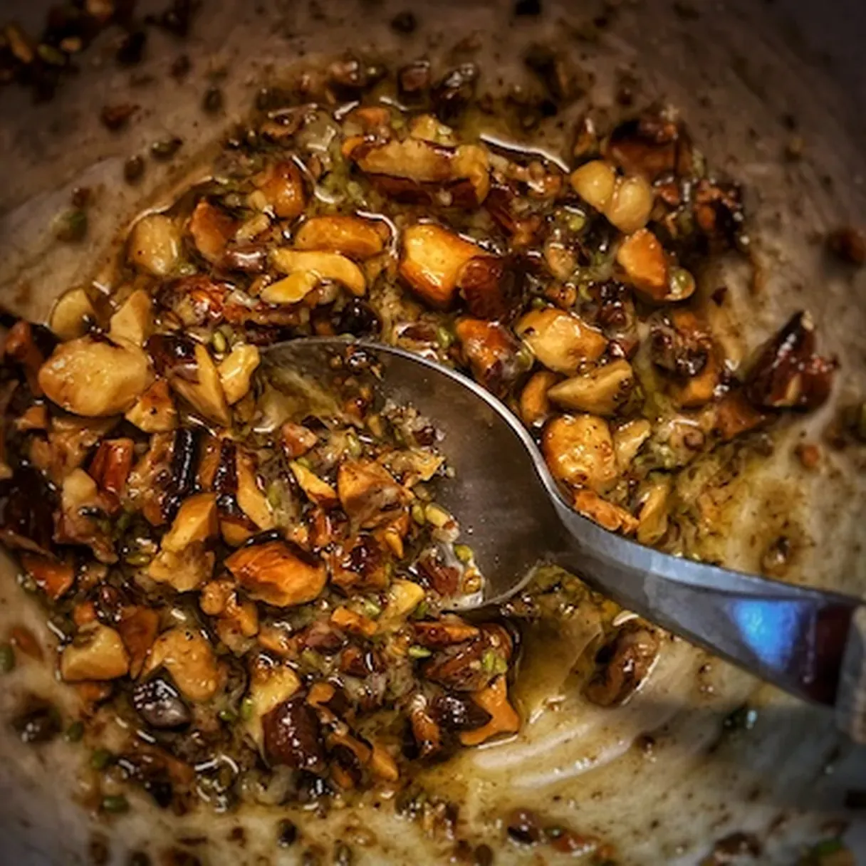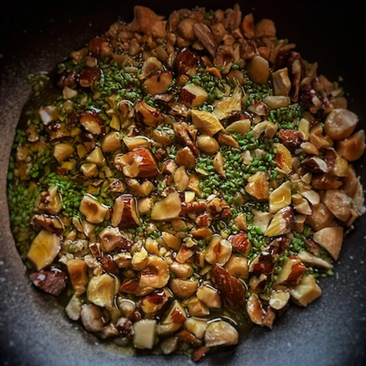 - Anyway, take a small skillet and heat up the olive oil. Add the nutty mixture and the sesame seeds. Cook everything at medium heat for 2-3 minutes until golden.