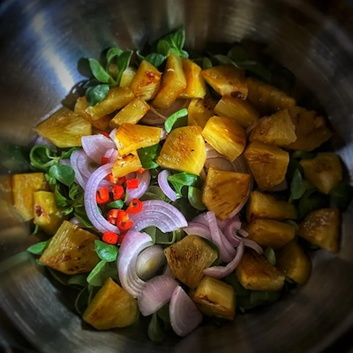 - Chop the onion any way you like, but don't make it too thin as you want to feel it. Add it to a bowl along with the valerian, red chili, and charred pineapple. Pour the fatty reduction and salt everything. Stir to combine.