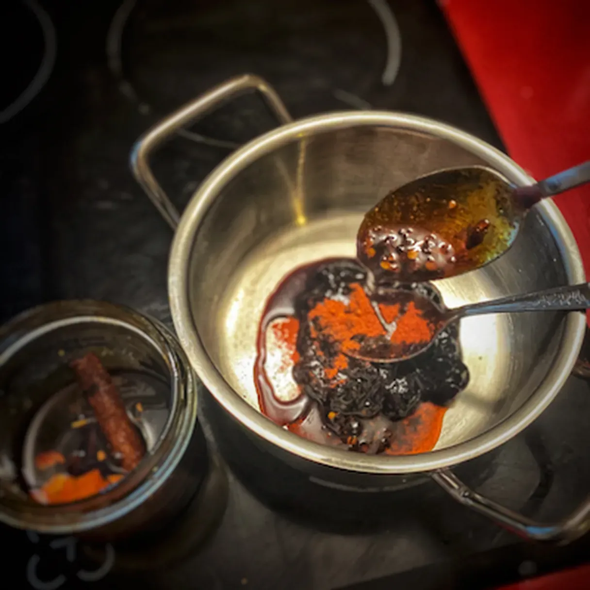 - With a knife start crushing the hazelnuts until they reach the texture of bread crumbs. Add them in a saucepan along with the cinnamon, clove, star anise, blueberry jam, chili flakes, sweet paprika, and the remaining olive oil.