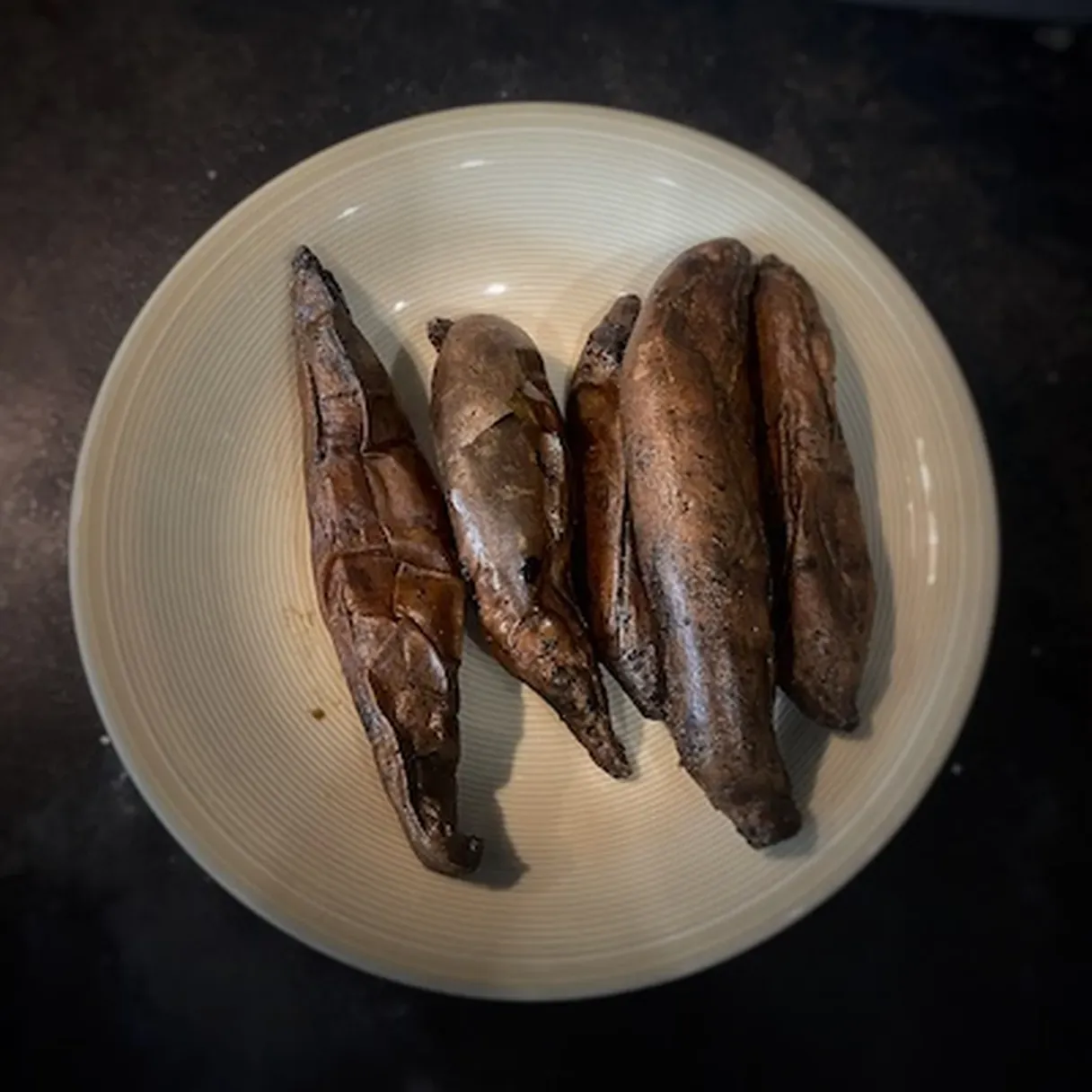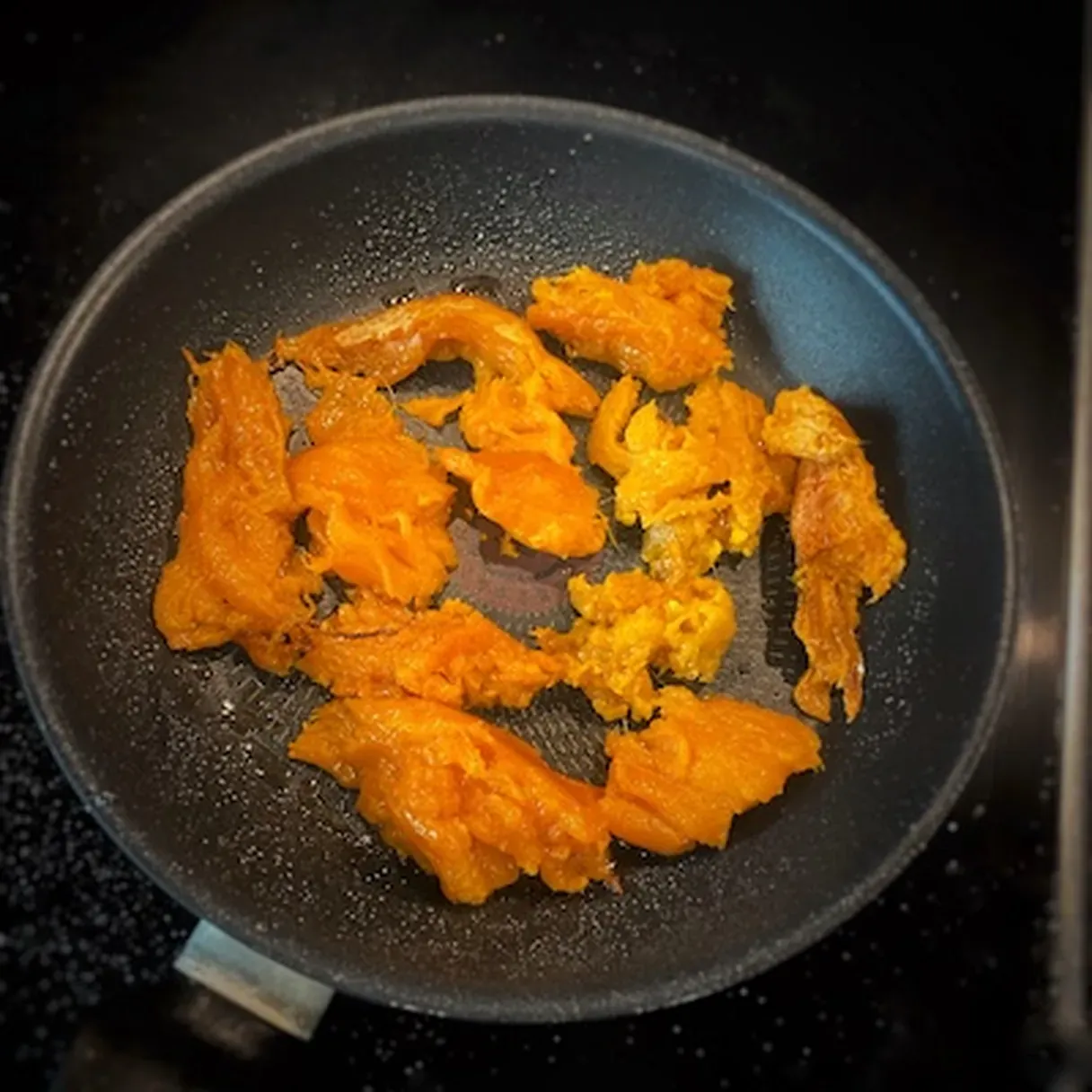 - Now, let's return to the sweet potatoes. Take them out of their skins and break them into 4-5 cm chunks.