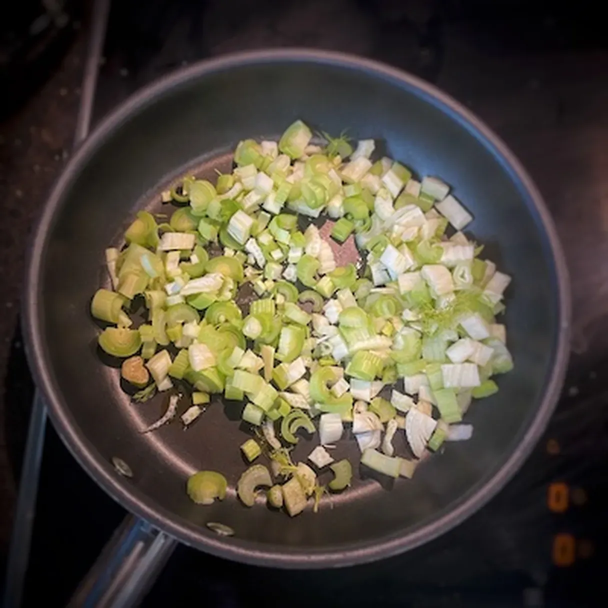 - Clean and chop the fennel, the celery, and the leek. Cook them in olive oil on medium heat for 5-7 minutes.