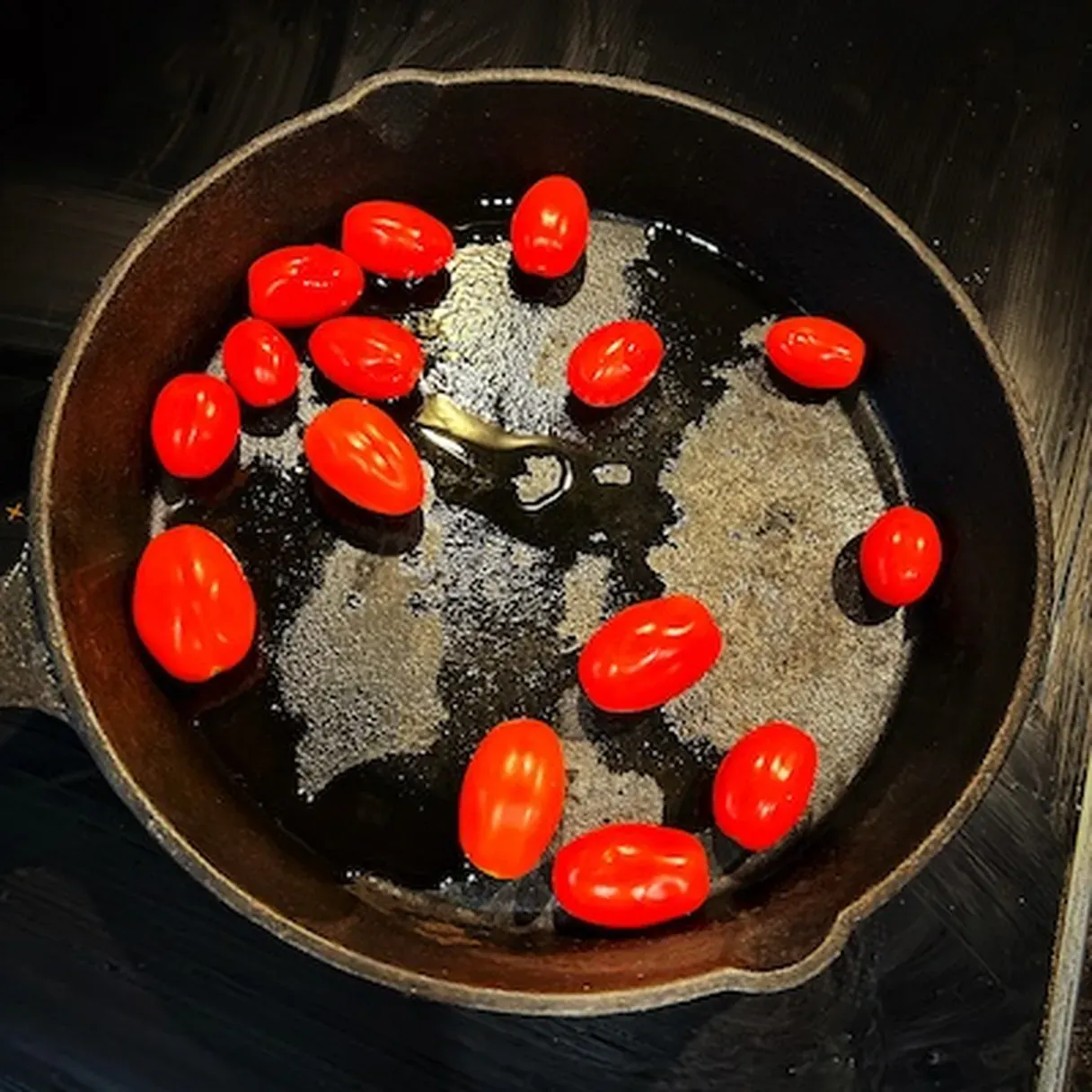 - Heat up a cast iron skillet and drizzle a little bit of olive oil. Char your cherry tomatoes for a couple of minutes on each side.