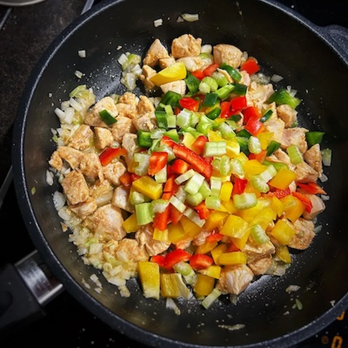 - Cooking the Chicken: Heat a pan on medium heat and cook the chicken. Add diced onion and cook for another 2-3 minutes. Then, add half a red, yellow, and green bell pepper, diced celery stick, and pineapple chunks from the can, and cook for 3-4 minutes.