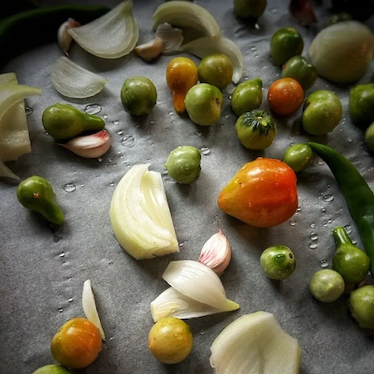 - Drizzle the tomatoes, onion, garlic, and green chili peppers with oil.